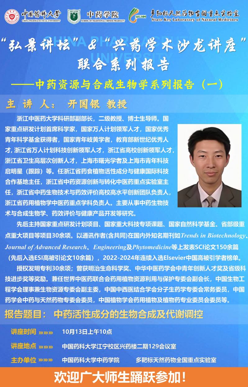 中药学院第二十三期“弘景讲坛”暨全国重点实验室兴药学术沙龙第十六期——中药资源与合成生物学系列报告(一):浙江中医药大学开国银教授学术报告