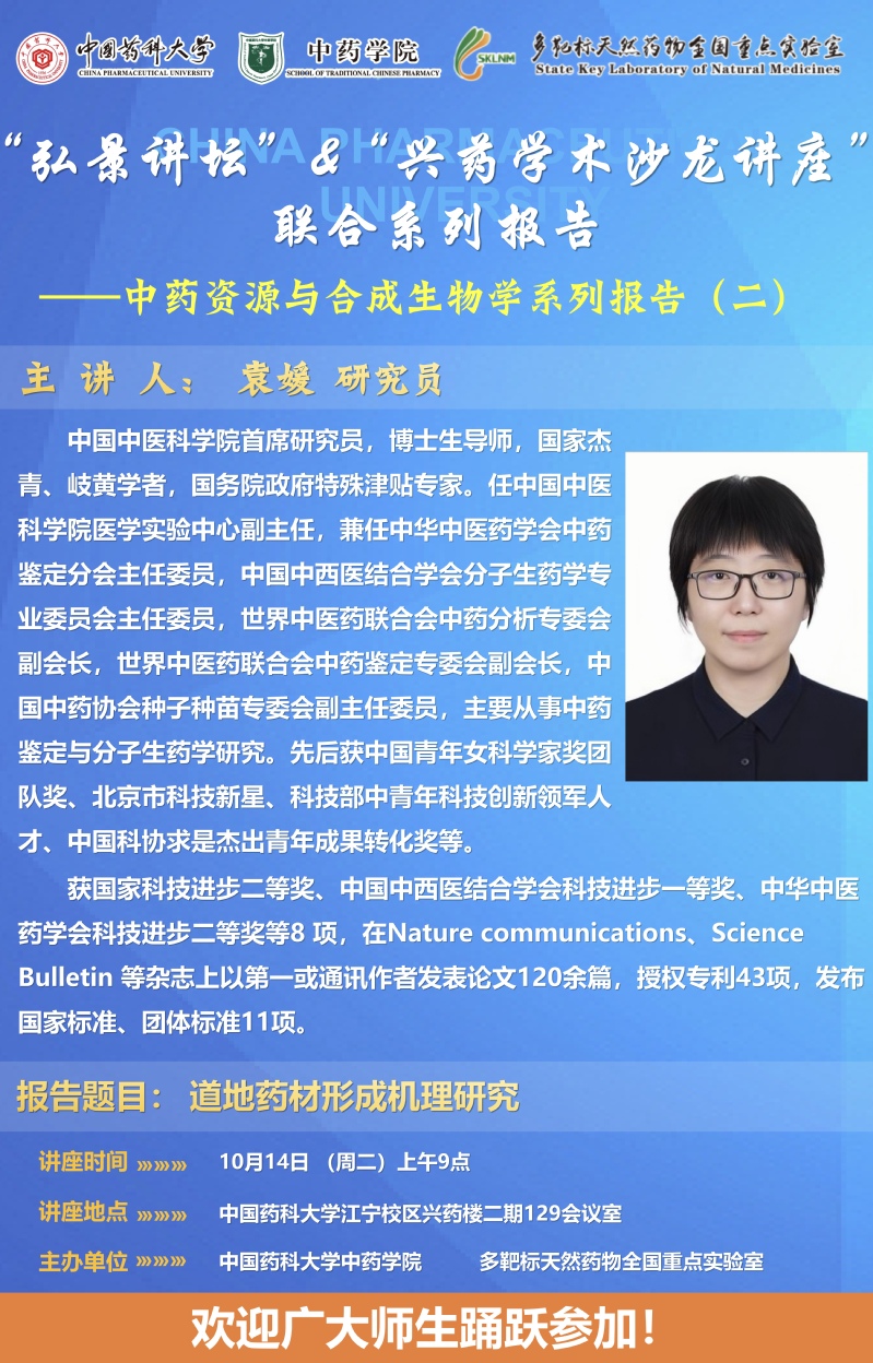 中药学院第二十四期“弘景讲坛”暨全国重点实验室兴药学术沙龙第十七期——中药资源与合成生物学系列报告(二):中国中医科学院袁媛研究员学术报告