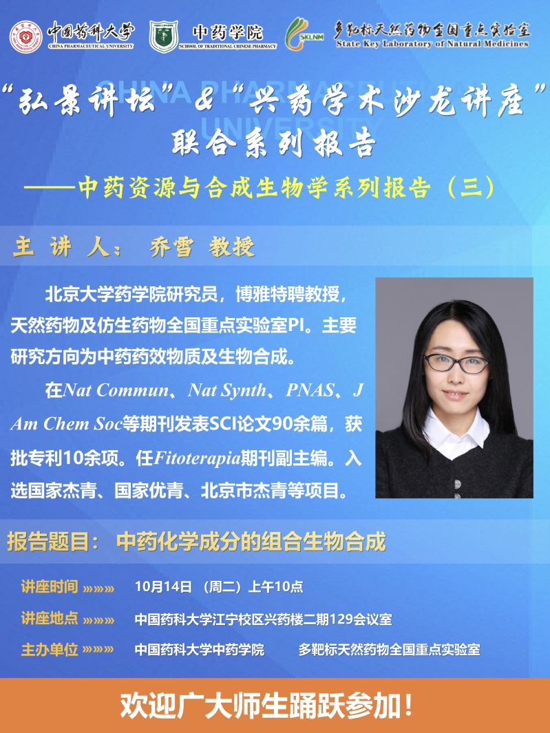 中药学院第二十五期“弘景讲坛”暨全国重点实验室兴药学术沙龙第十八期——中药资源与合成生物学系列报告(三):北京大学乔雪教授学术报告