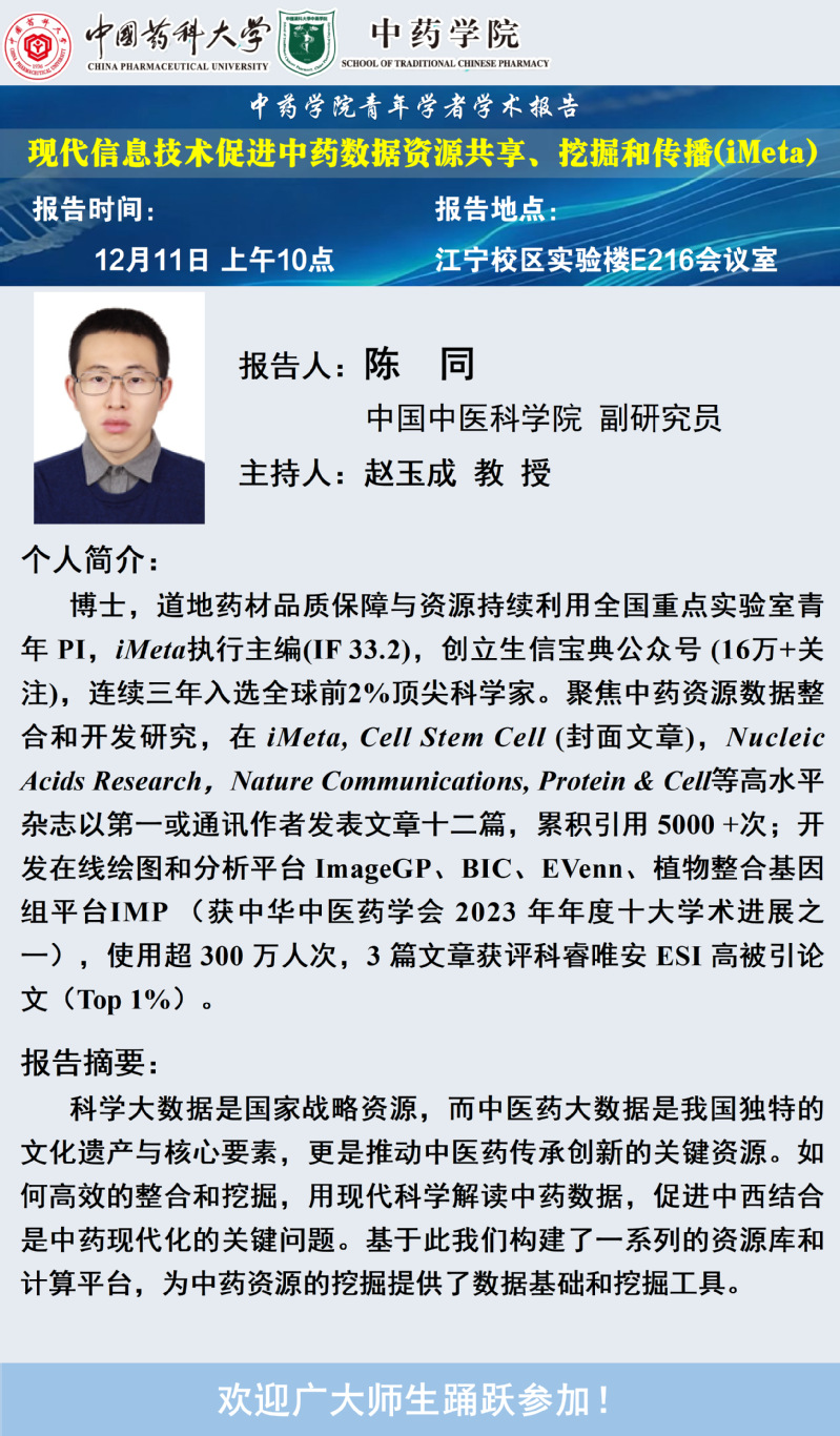 中药学院青年学者学术报告——现代信息技术促进中药数据资源共享、挖掘和传播(iMeta)
